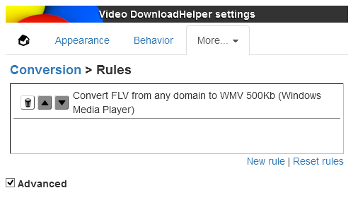 As an advanced usage of the conversion feature, you can specify one or several conversion rules. This will allow, for instance to specify that every time you download a FLV file, it will be converted to MP4 without you having to do anything special with the user interface. Or you can say that any video downloaded from a given domain will be converted.